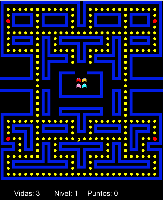 Pacman: eat all the small dots to get to the next level.